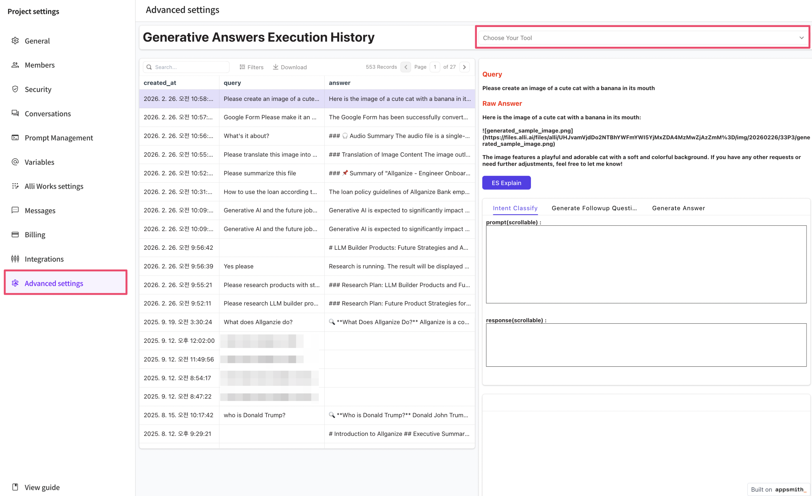 * **Enable option:** In the 'Advanced Settings' tab, find the 'Choose Your Tool' option and select the Generative Answers Execution History option from the dropdown list.