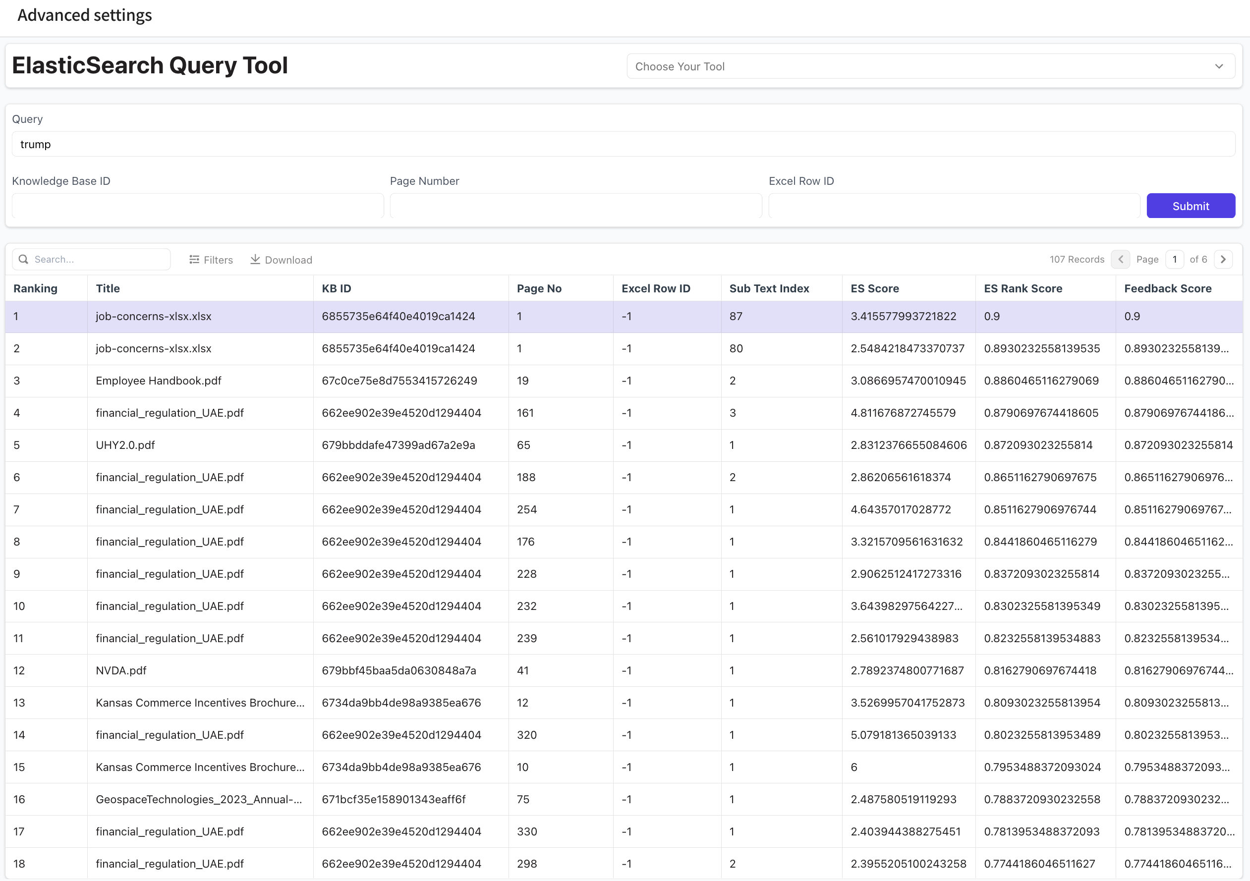 * **ES Explain:** If you want to check the document ranking chosen by the model, click that button. This lets you see which documents and pages were considered clue candidates and how they were ranked.