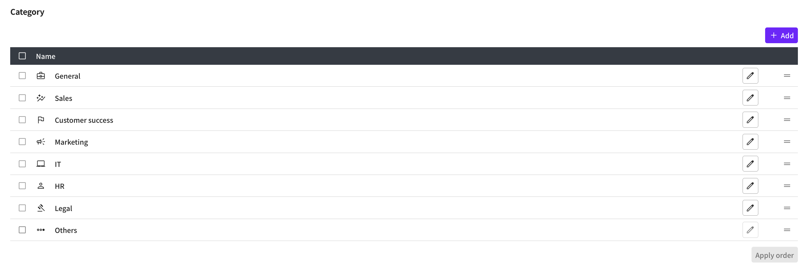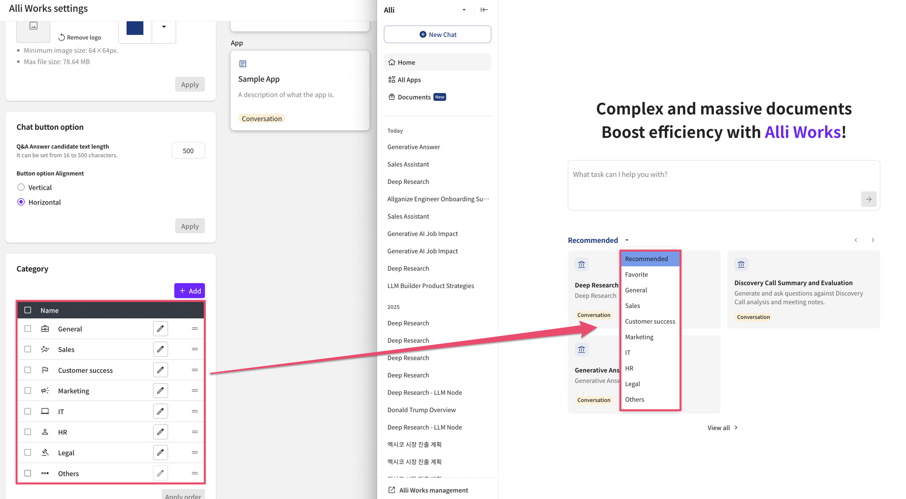 You can change the order of categories displayed in Alli Works or add new categories.