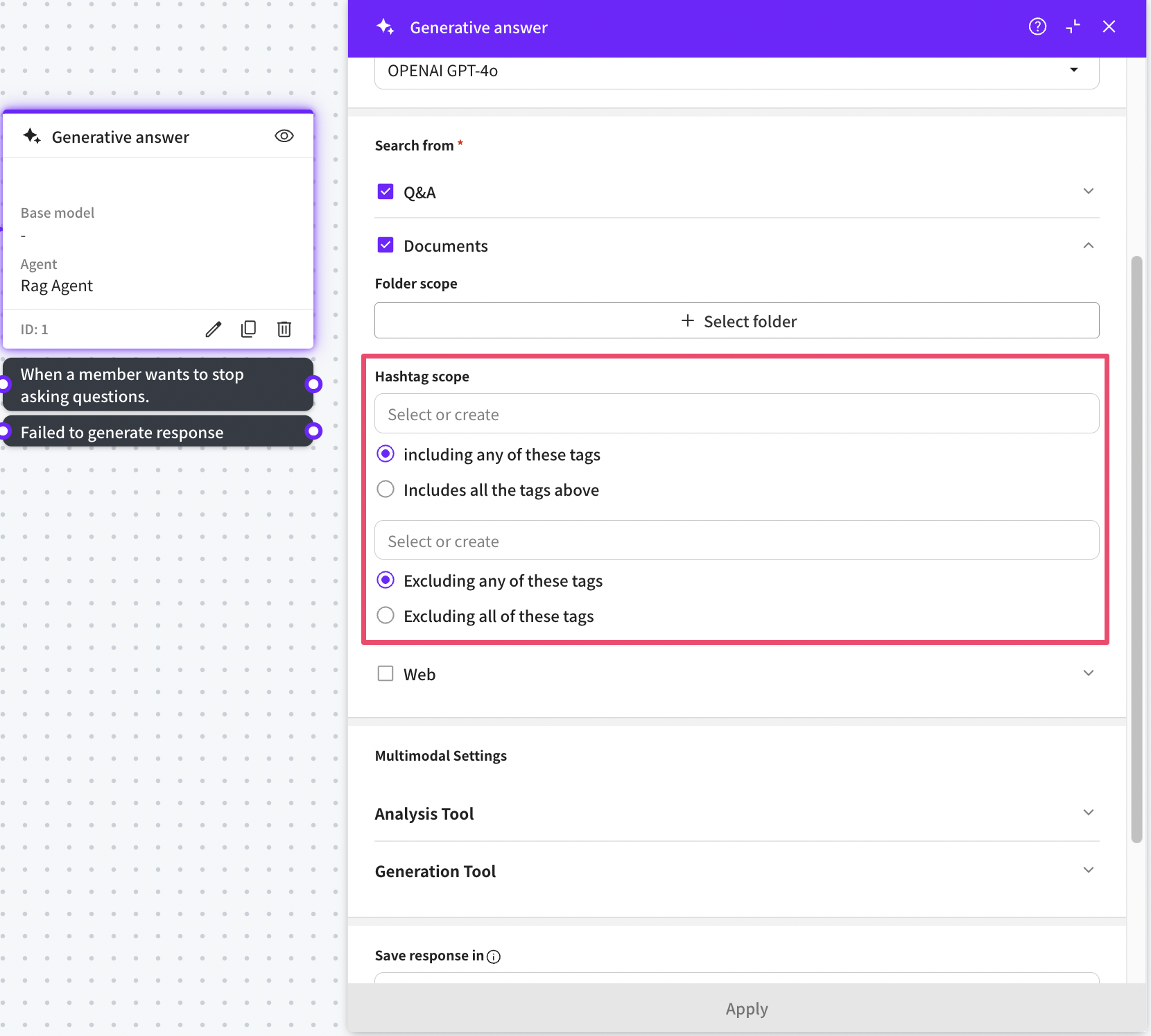 * For example, if you want only finance-related documents from a particular app to be used for answer generation and want to exclude management-related documents, you can use hashtags to set it up as follows: