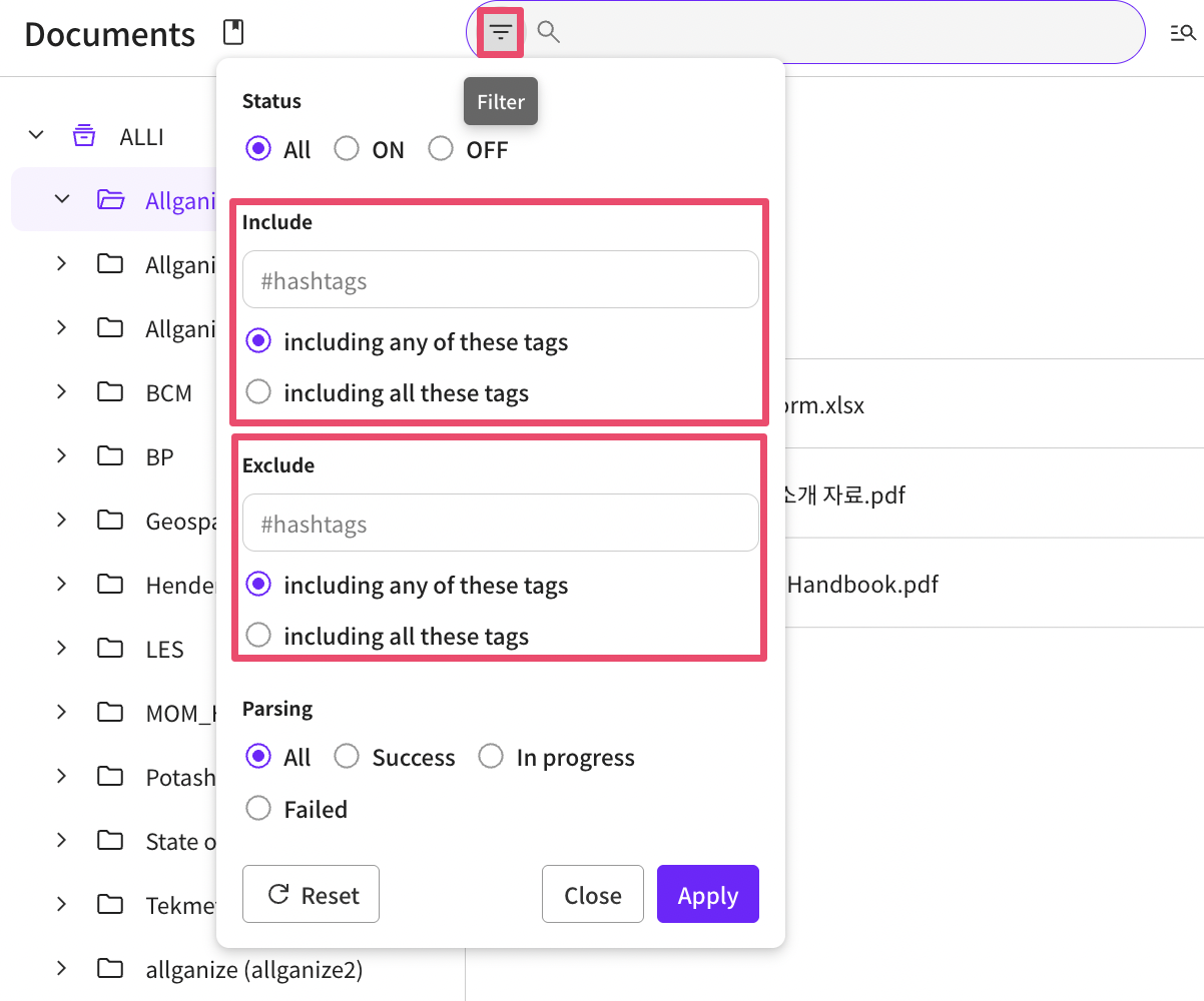Click the **filter icon**to the left of the search bar at the top of the Documents menu. Along with document ON/OFF and parsing status, **hashtags to include**and **hashtags to exclude**can be filtered.