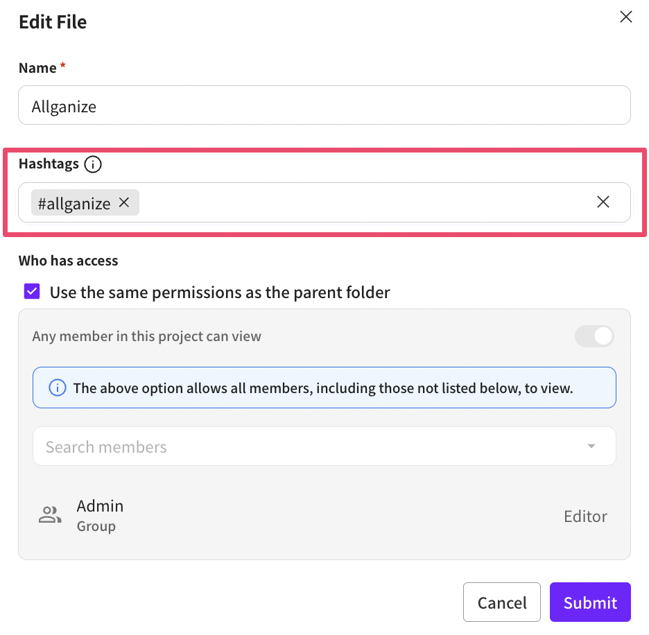 * Hashtags can be used as filtering conditions when searching documents to help include only documents containing certain tags or exclude documents containing certain tags.