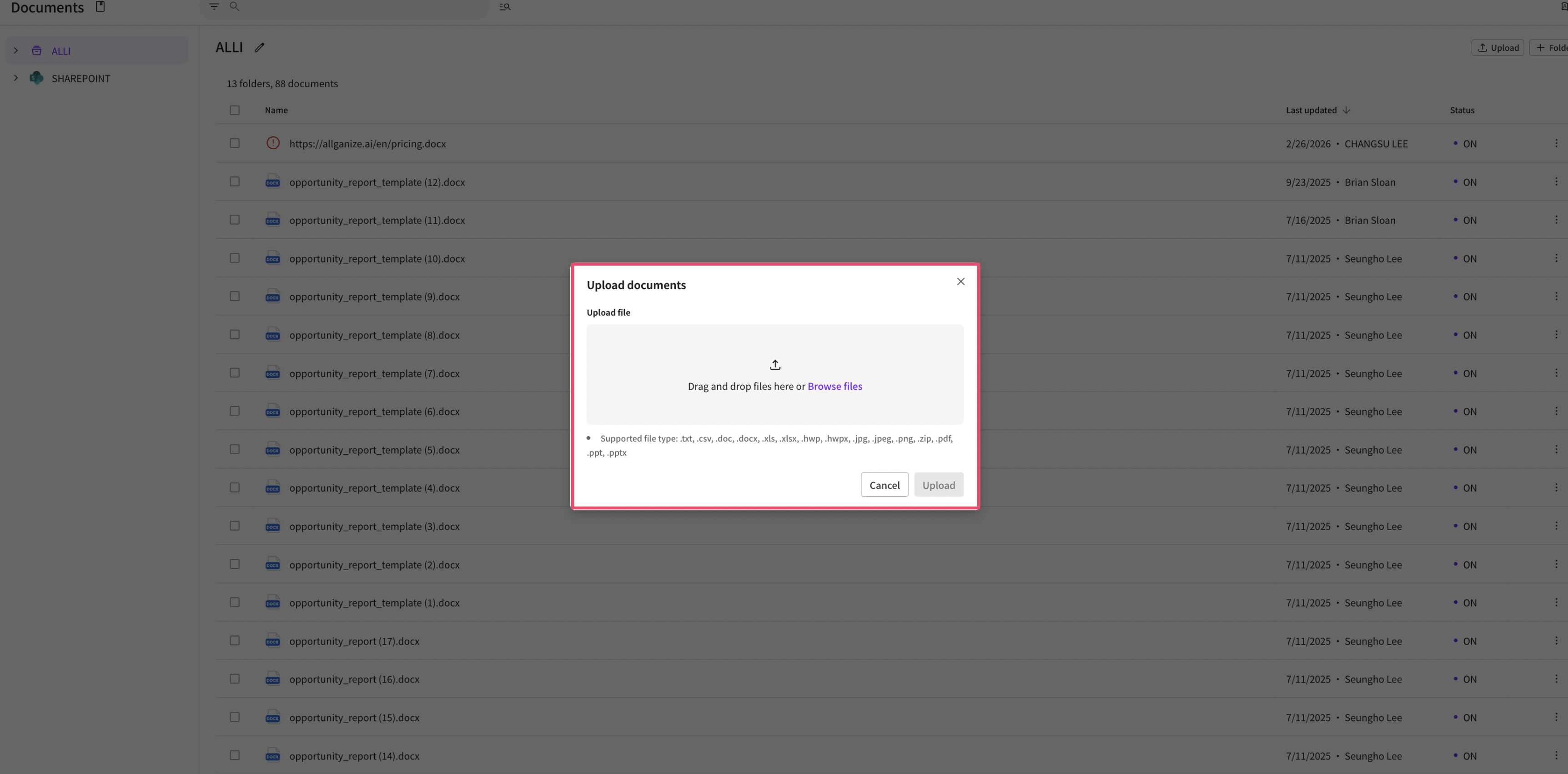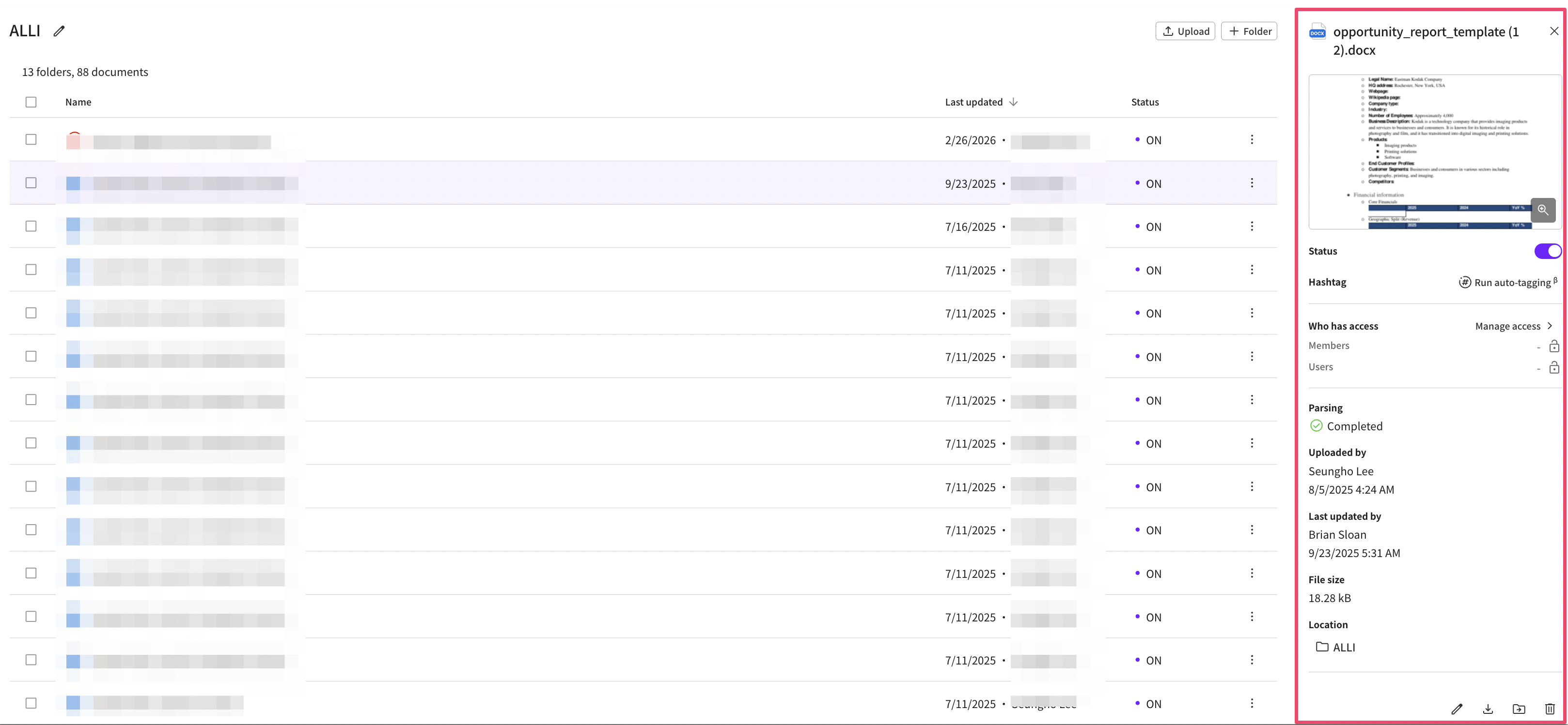 4. **View document details:** When you select a specific document, **detailed metadata for that file**will be displayed on the right. - **Status** : Indicates whether the document is active. Active documents are used when retrieving answers during searches. - **Hashtags** : Metadata that can be used when searching documents. If hashtags are set, you can apply search filters based on them. If there are no hashtags, searches are performed across all documents or within the specified folder in the node.