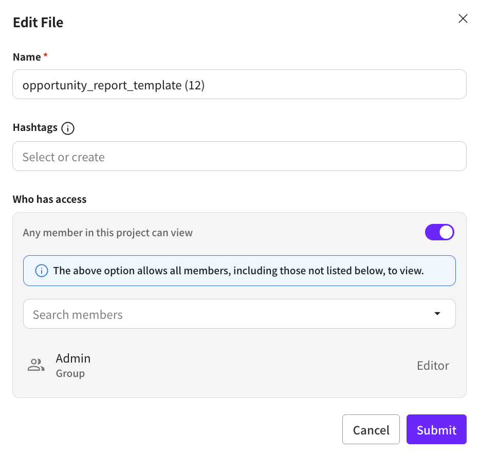 3. Edit file (optional) Click the 'Edit' button to rename the file, add hashtags, and set access permissions. You can edit the same way even after uploading. The editing details are explained below.