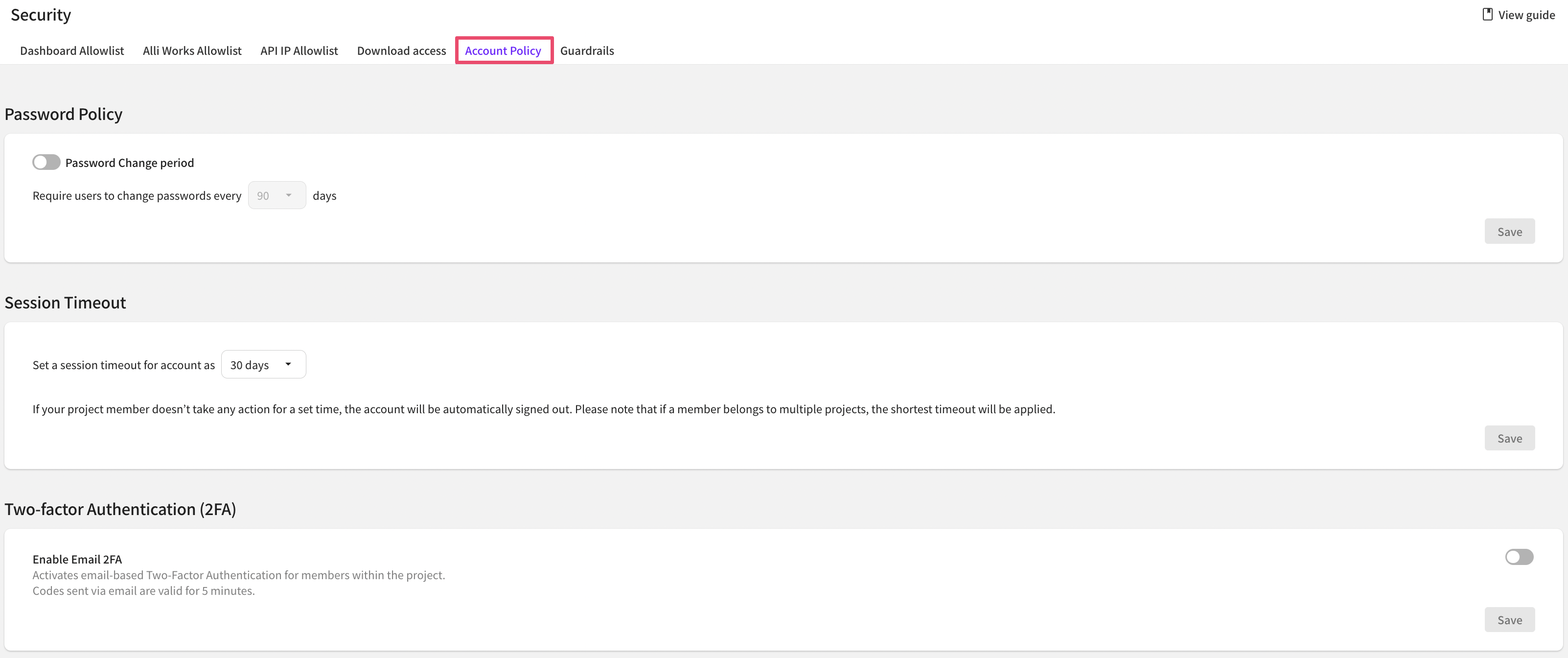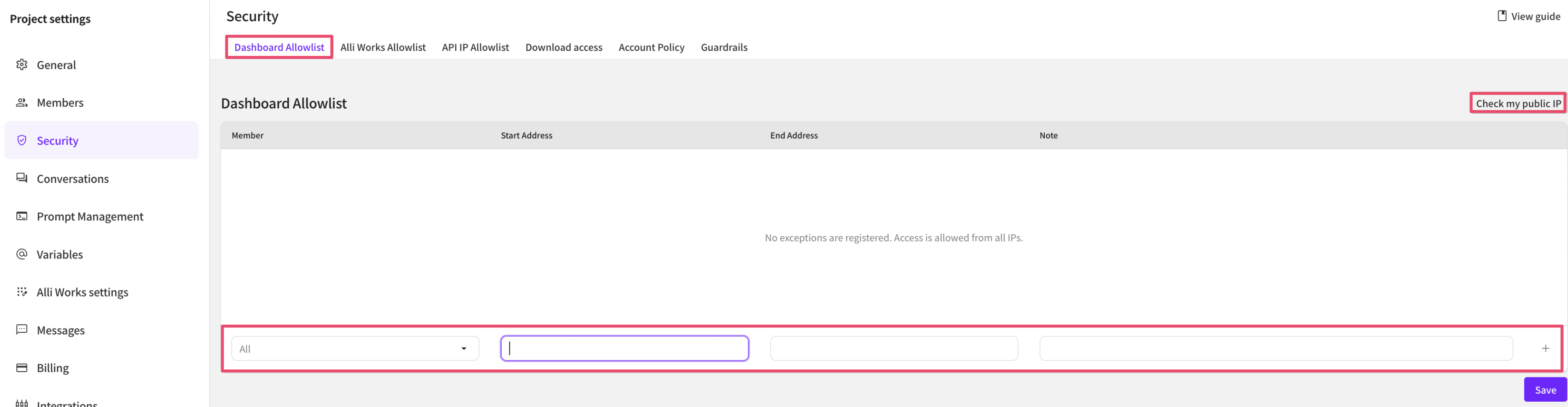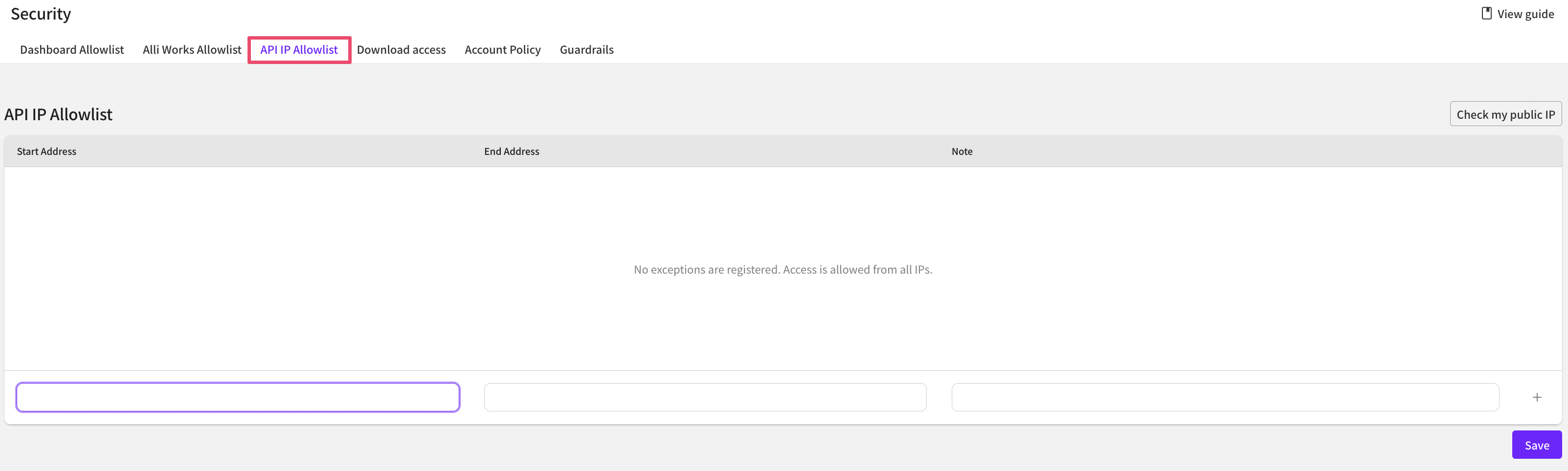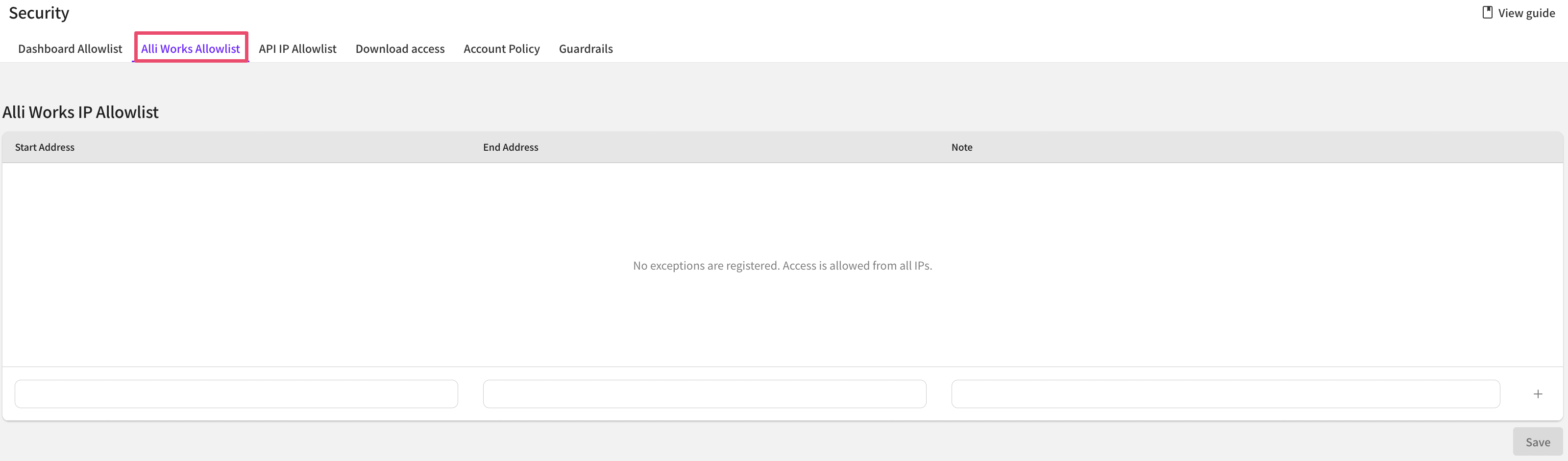 **Security** By clicking the tab, you can configure the dashboard, Alli Works, API IP, download IP whitelists, and password policies.