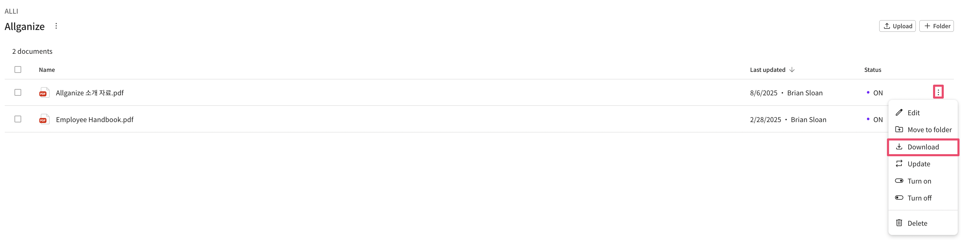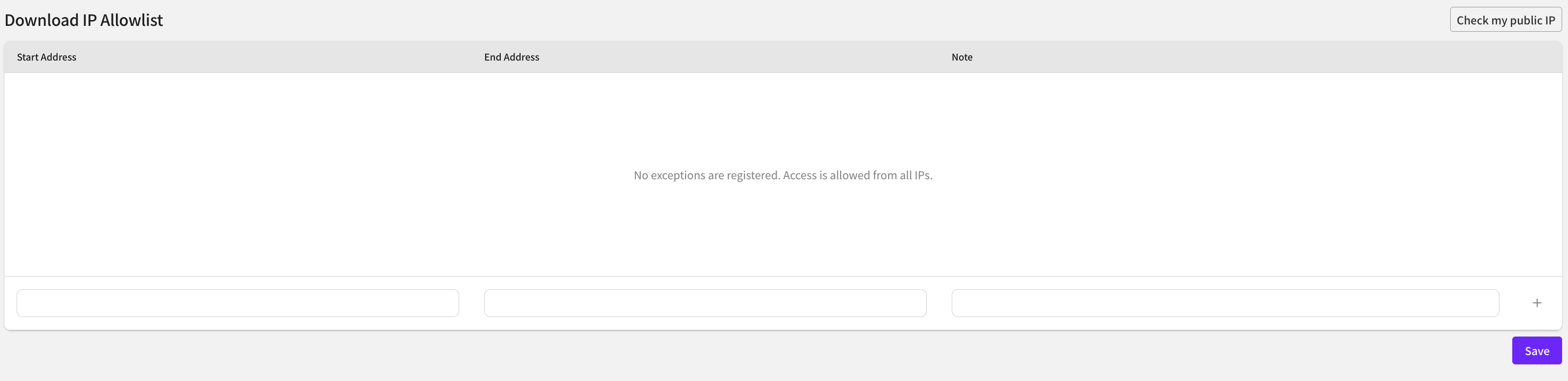 If you set a download IP whitelist, files can be downloaded from the SDK and dashboard only within the configured IP ranges. **This setting does not apply when downloading Q\&A content or documents from the knowledge base.** Files attached to Q\&A, files shared during conversations, and files stored in variables are subject to this setting.