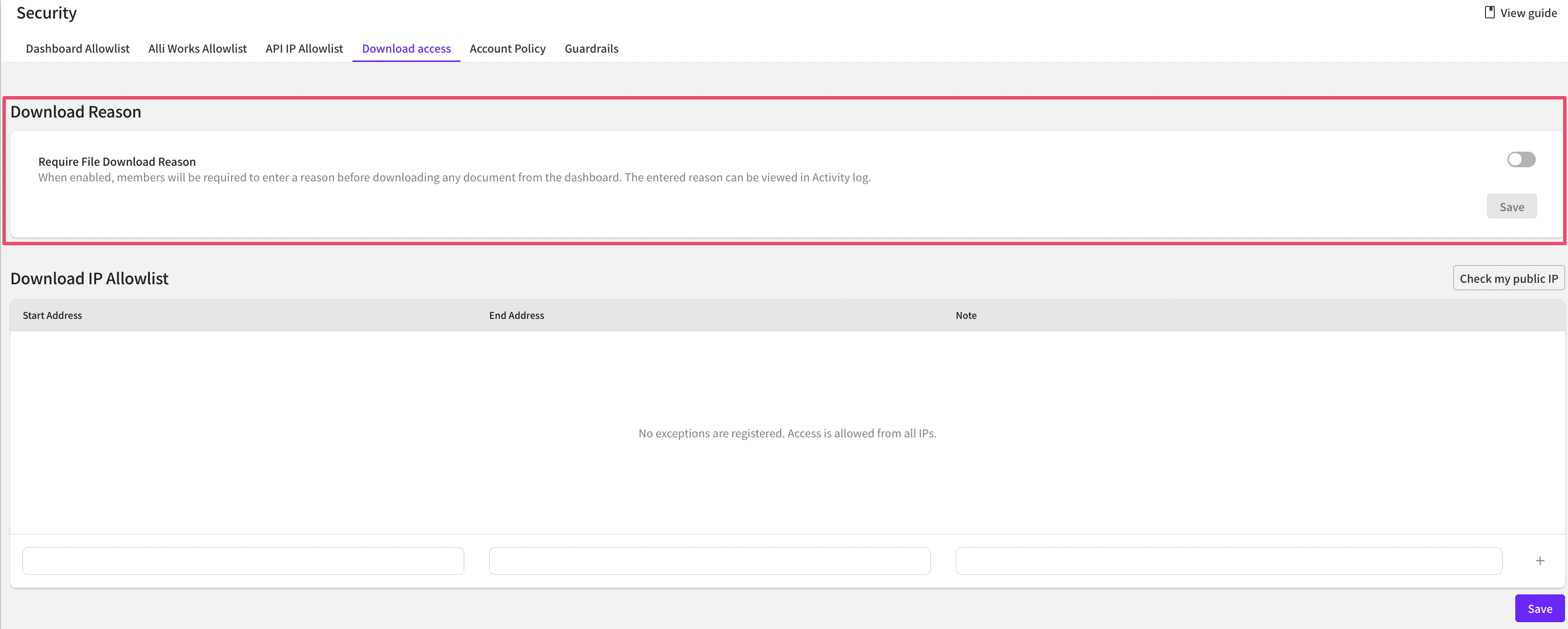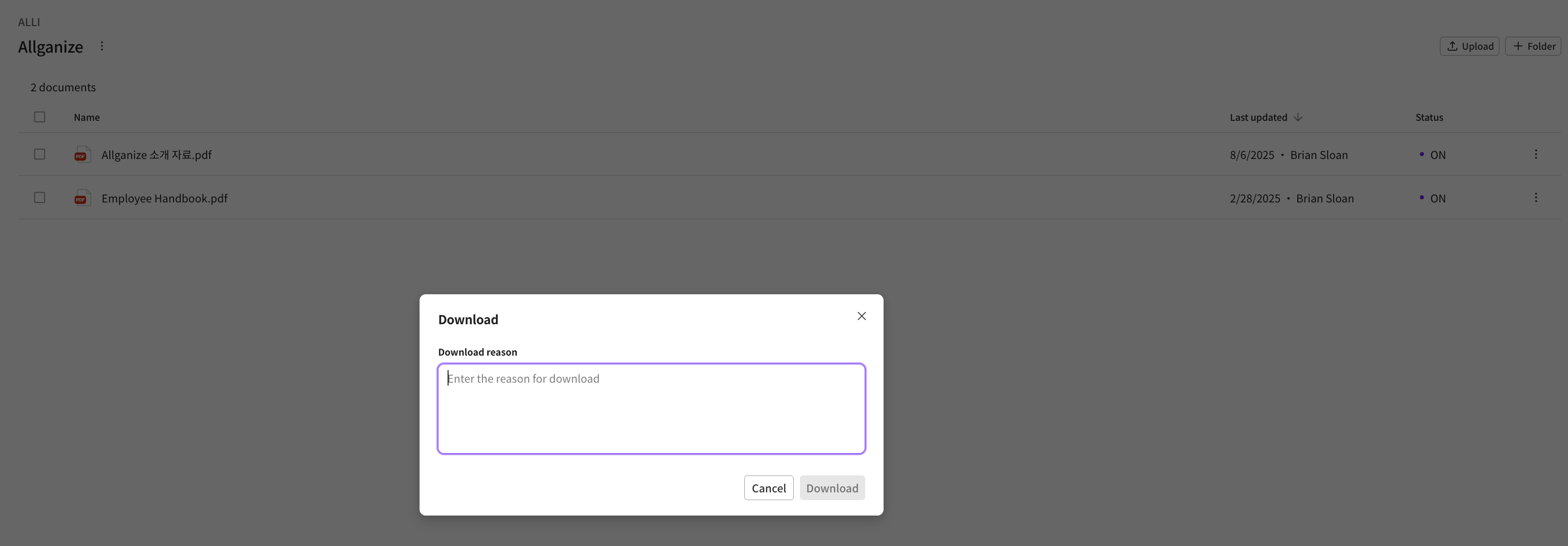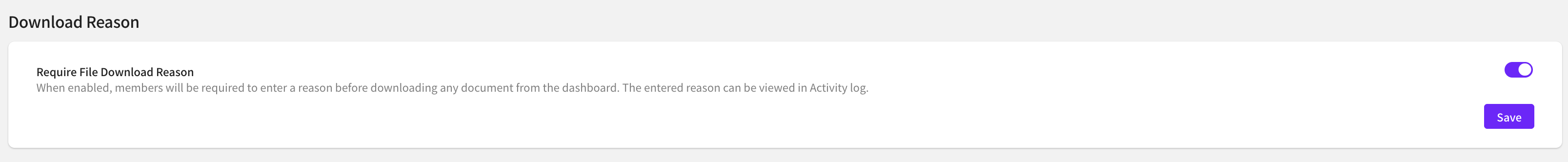This feature is an option that can require members to enter the purpose and reason when downloading files from the dashboard. It helps ensure transparency of download actions for security and audit purposes.