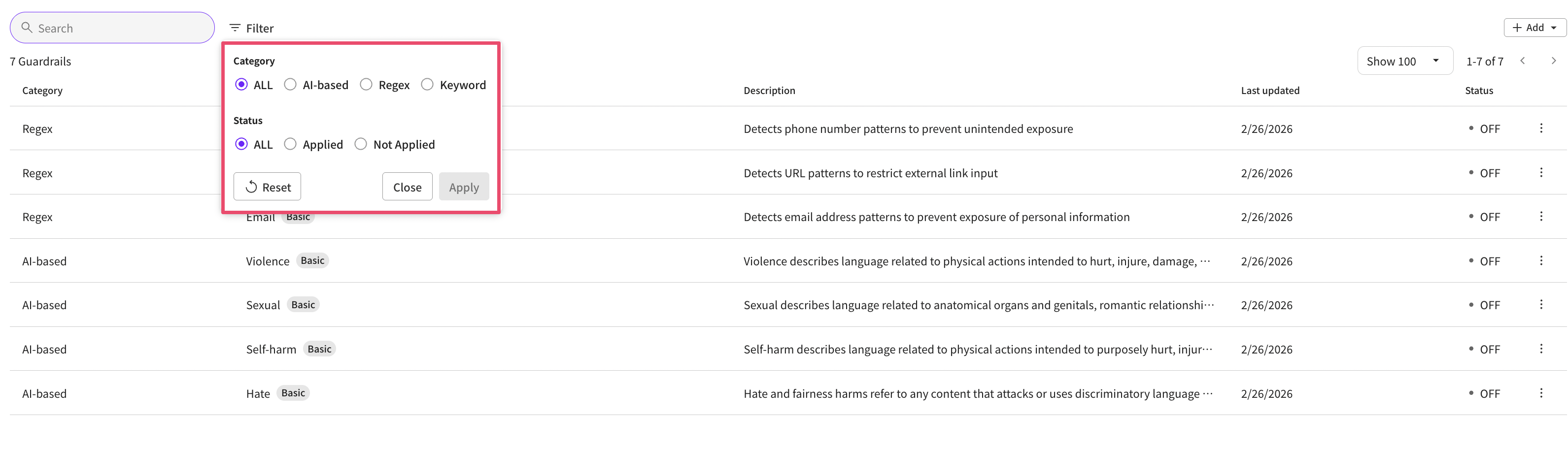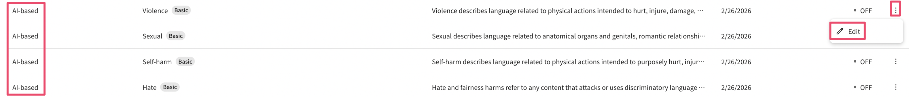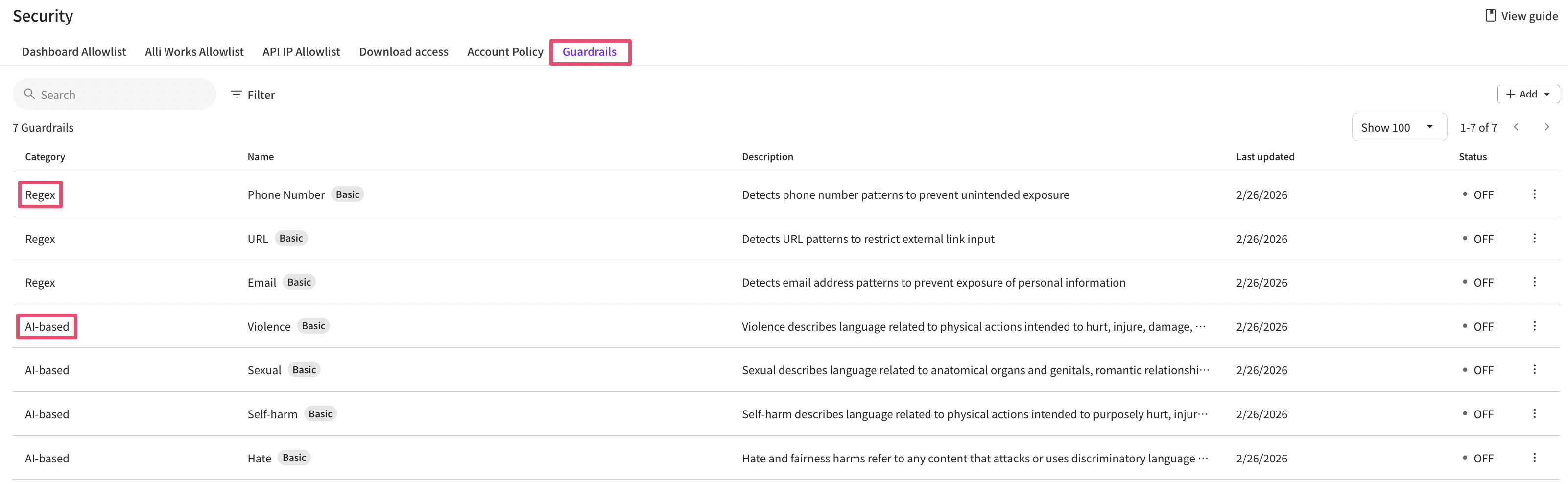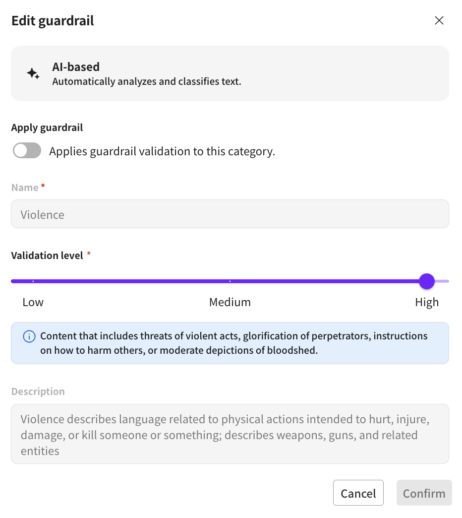 AI-based guardrails cannot be newly created; you can change settings for the four default provided categories.