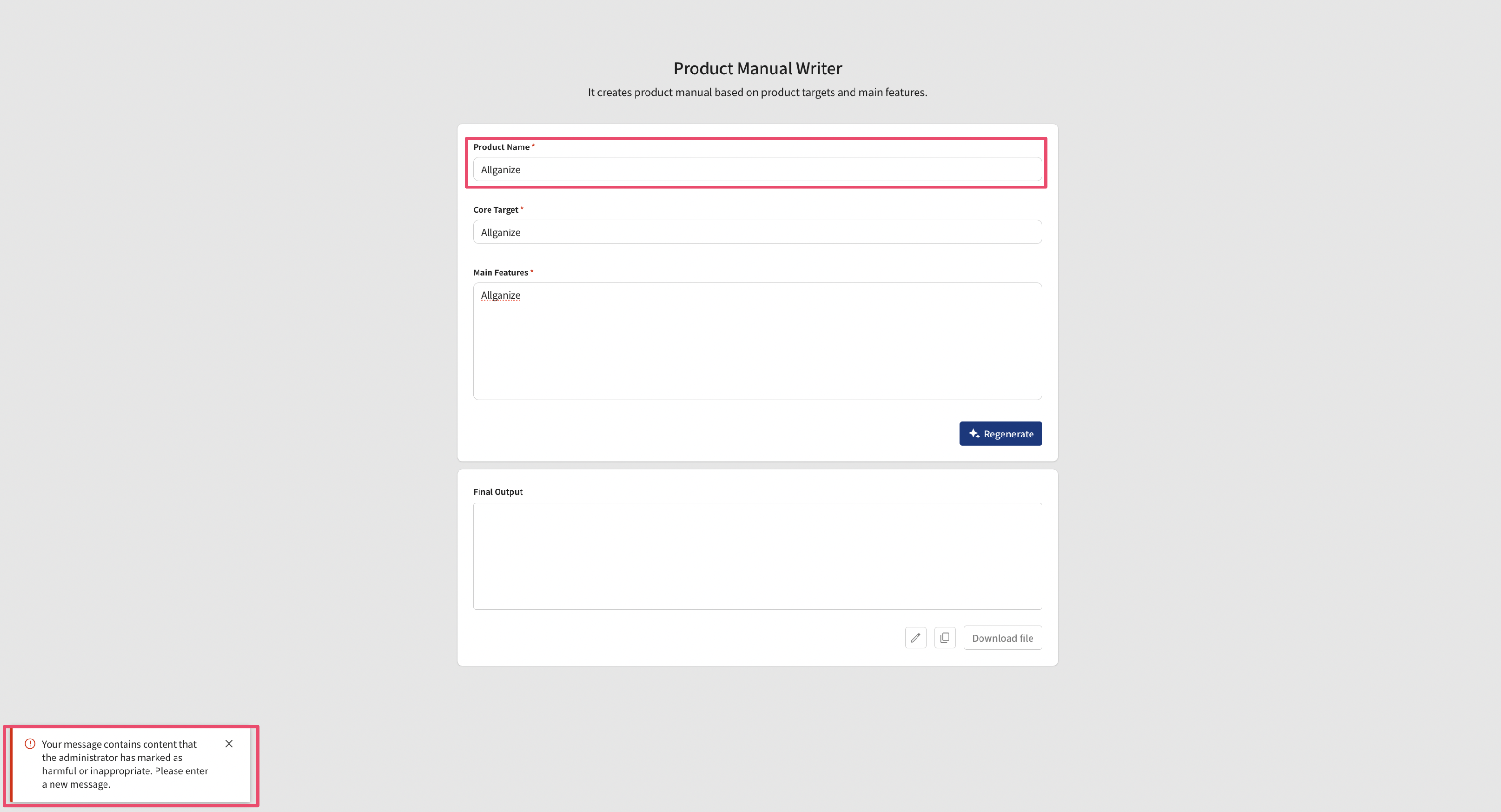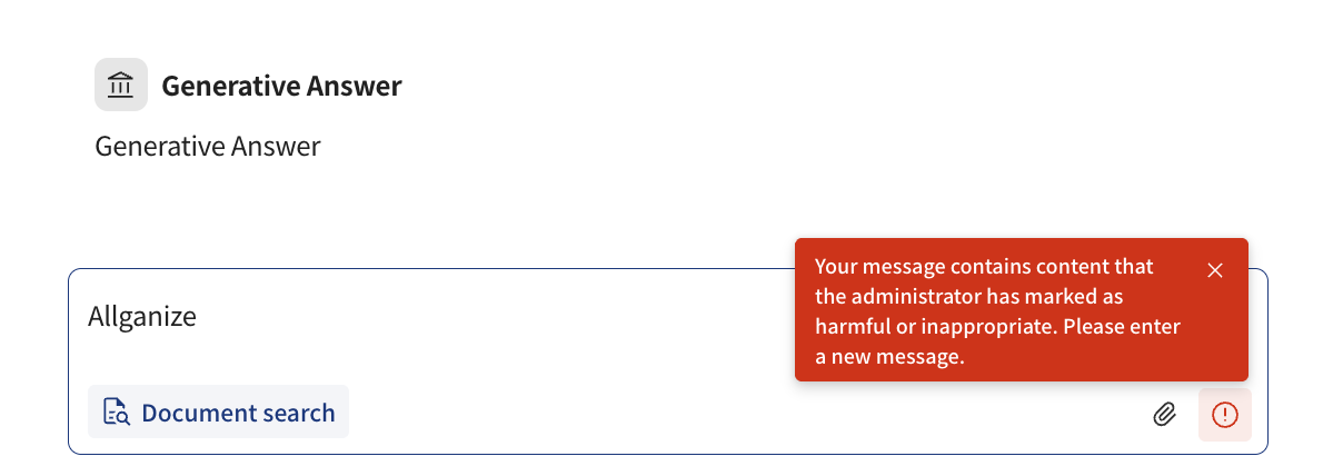 4. Depending on the verification strength set in advance for the AI-based guardrail, if the AI analyzes the message content and judges there is a possibility of policy violation, the message send button will be disabled and a warning message will be displayed. In this case, the user will be prompted to enter a new message. **Due to the nature of AI-based evaluation, judgments can vary depending on surrounding context, word combinations, or memory. Therefore, please note that results cannot be strictly dichotomized or guaranteed 100% accurate.**