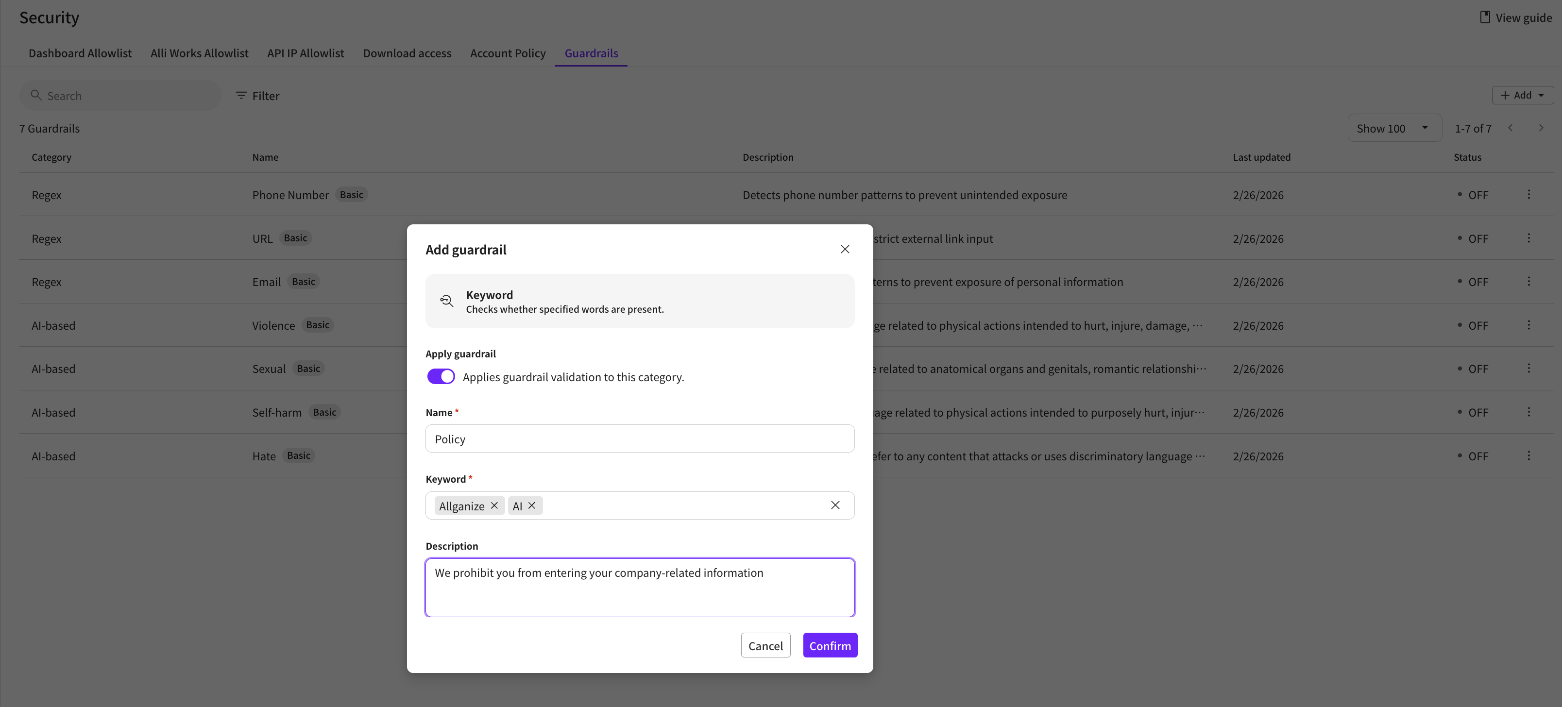 AI-based guardrails cannot be newly created; only the provided items can be adjusted and edited.