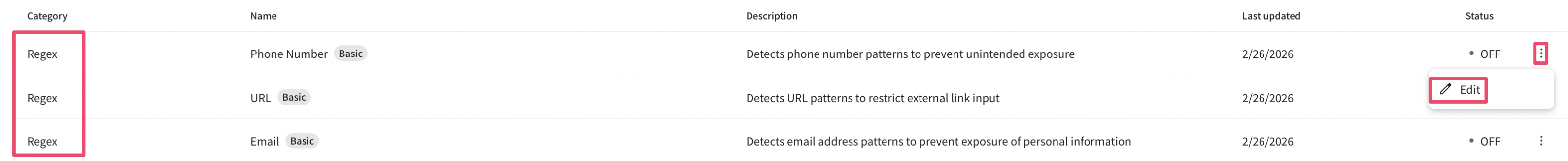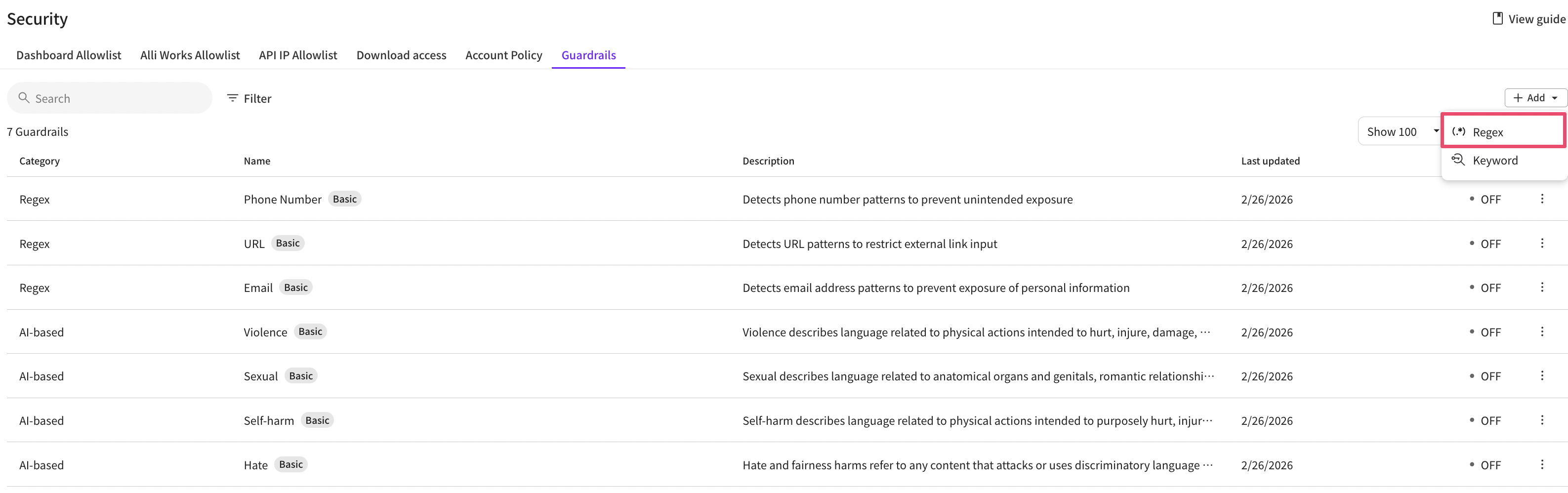 * Regular expressions provided by default in Alli cannot be modified; only activation/deactivation can be adjusted.