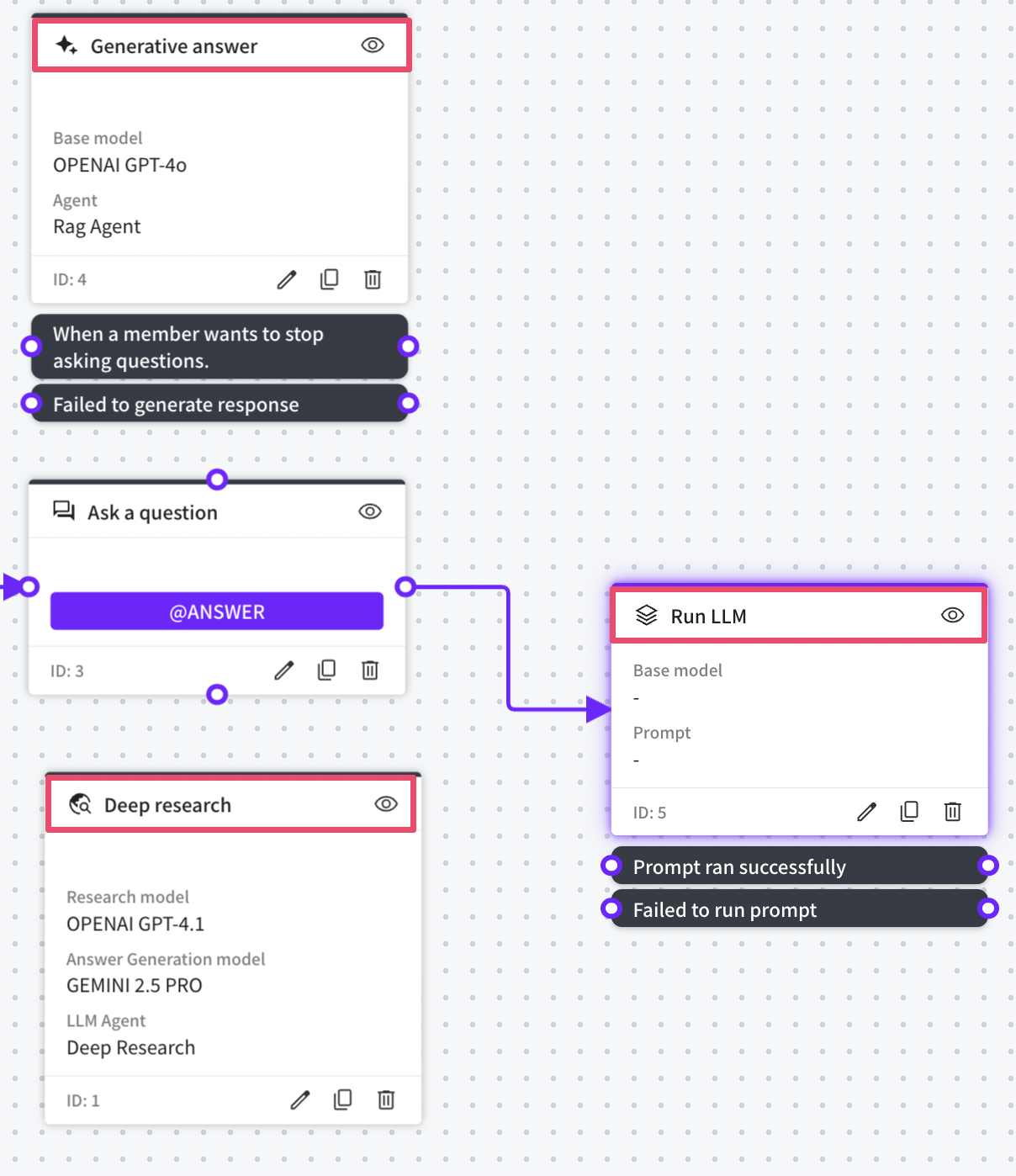 * Question node + LLM execution node When user input is received in a question node and then the model is called via an LLM execution node based on that content