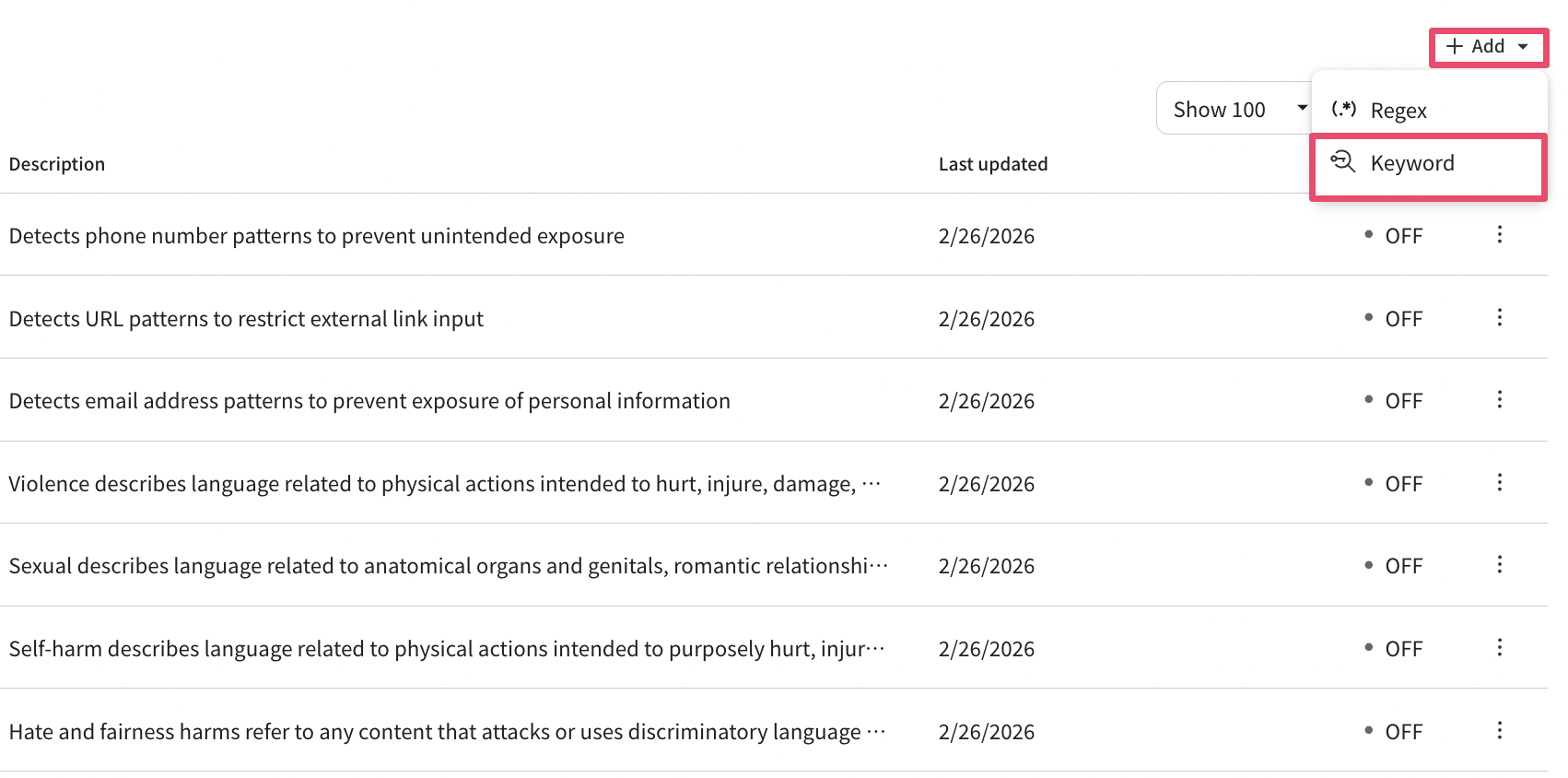 * Keywords are not provided by default; to add new keywords you must create a new guardrail.