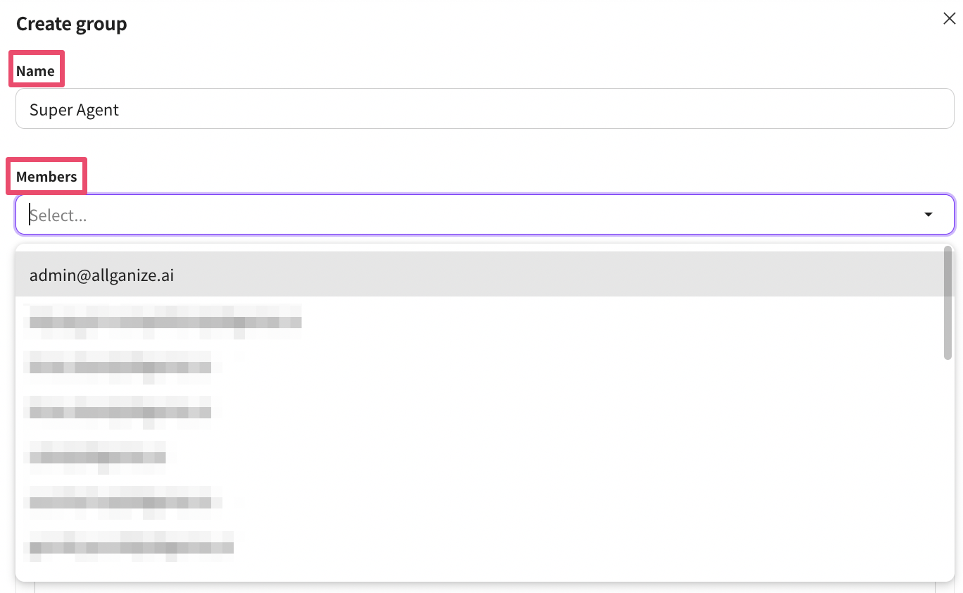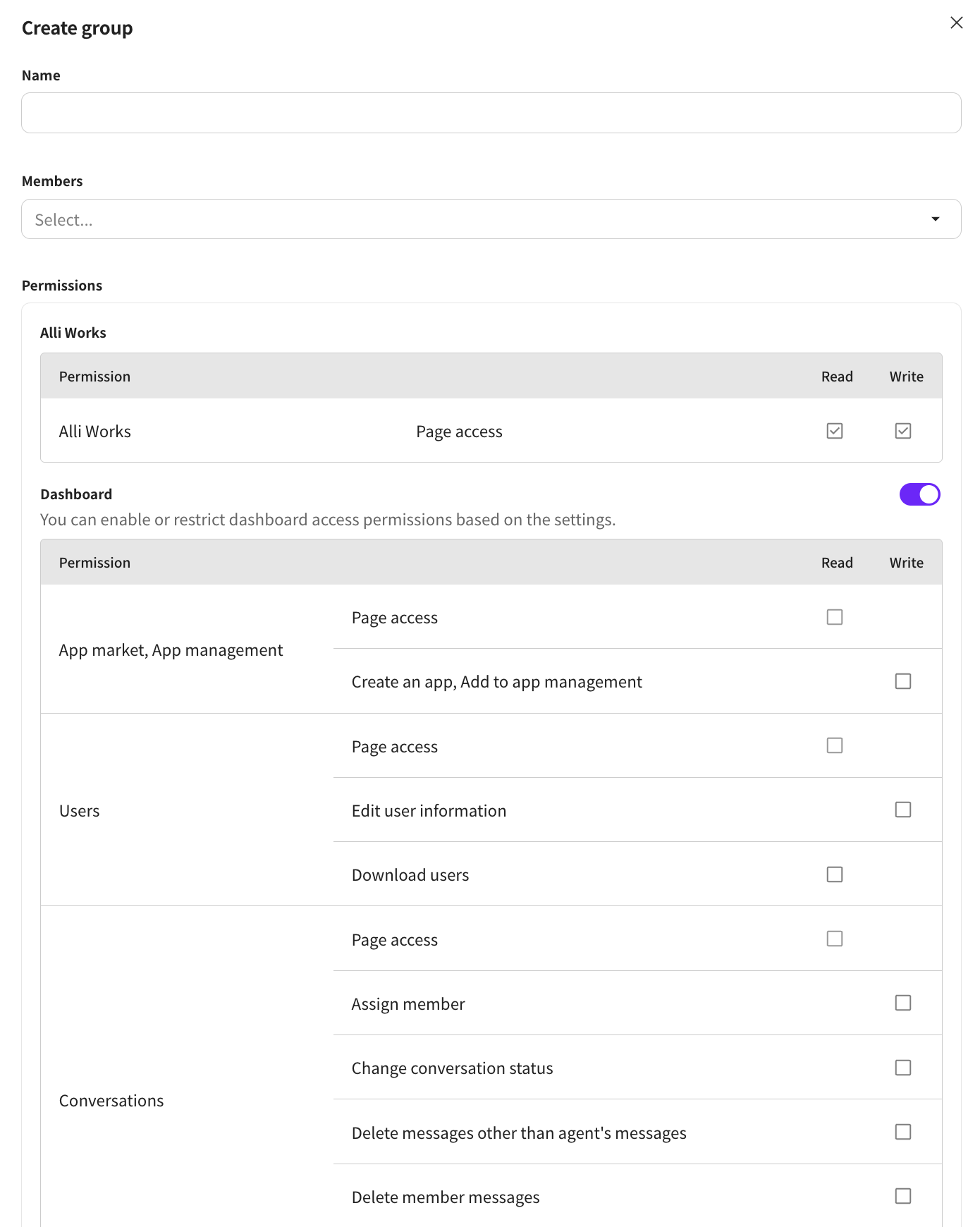 In Alli, individual users are called members, and collections of these members grouped by roles and permissions are called groups. By using groups, you can set member permissions in bulk or efficiently organize management by work unit.