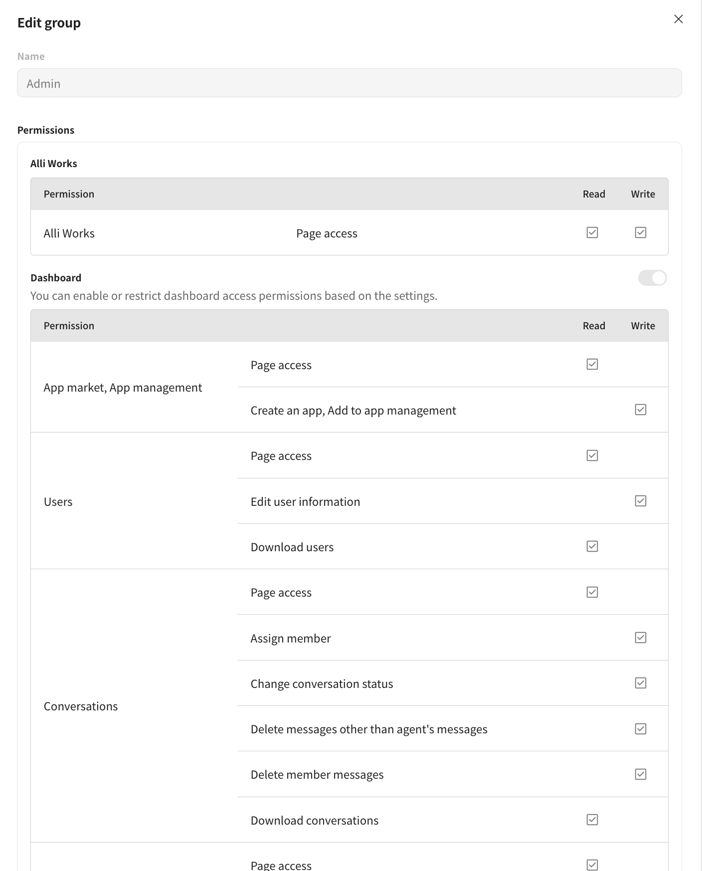 2. Change group name and modify permissions (※ Admin cannot be changed)