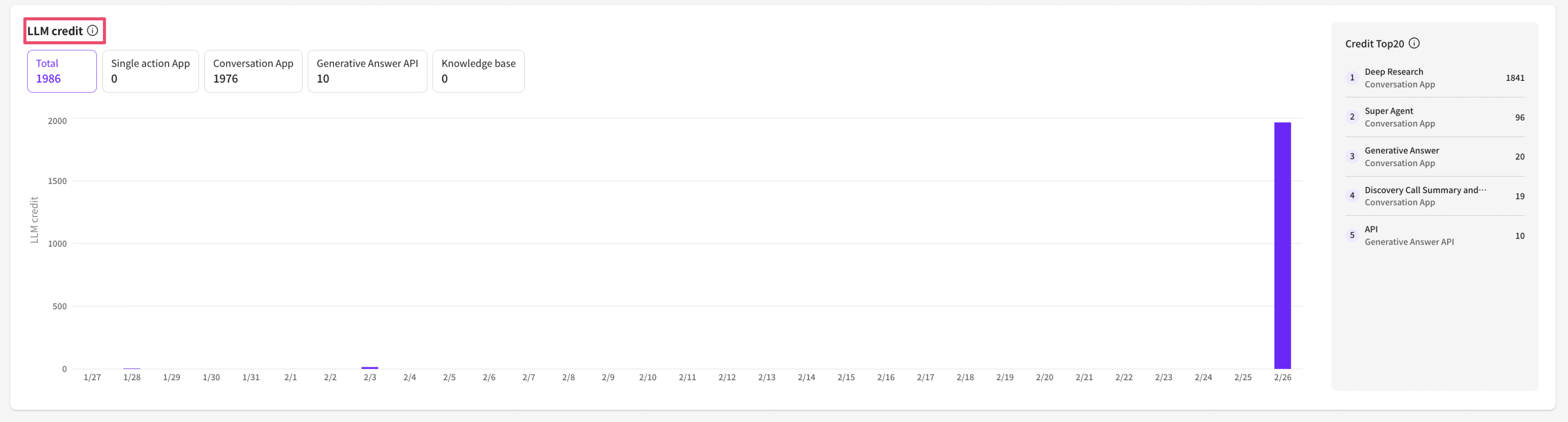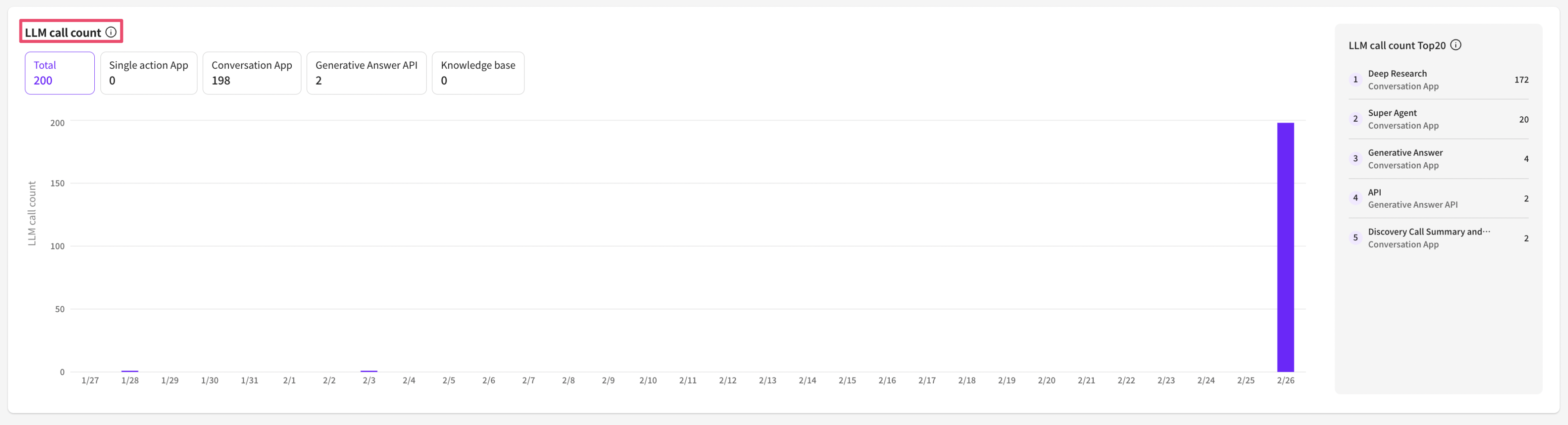* LLM call count: The actual number of times the LLM was called in that project. \*Numbers used when testing to install apps on the App Market page are not included. - Total: The combined number of LLM executions from answer-type apps, conversational apps, APIs, and knowledge base. - Answer-type apps: The number of times the LLM was executed until an answer was generated or an action was executed. - Conversational apps: The number of times the LLM was executed until an answer was generated or an action was executed as a result of member input. - Answer-generation API: The number of times the LLM was executed when generating an answer via the API. This aggregation counts only answer generation, so if the API triggered other apps, those apps are categorized and aggregated under answer-type / conversational apps. - Knowledge base: The number of times the LLM was executed when performing Q\&A generation and summarization tasks on the knowledge base screen in the Dashboard.