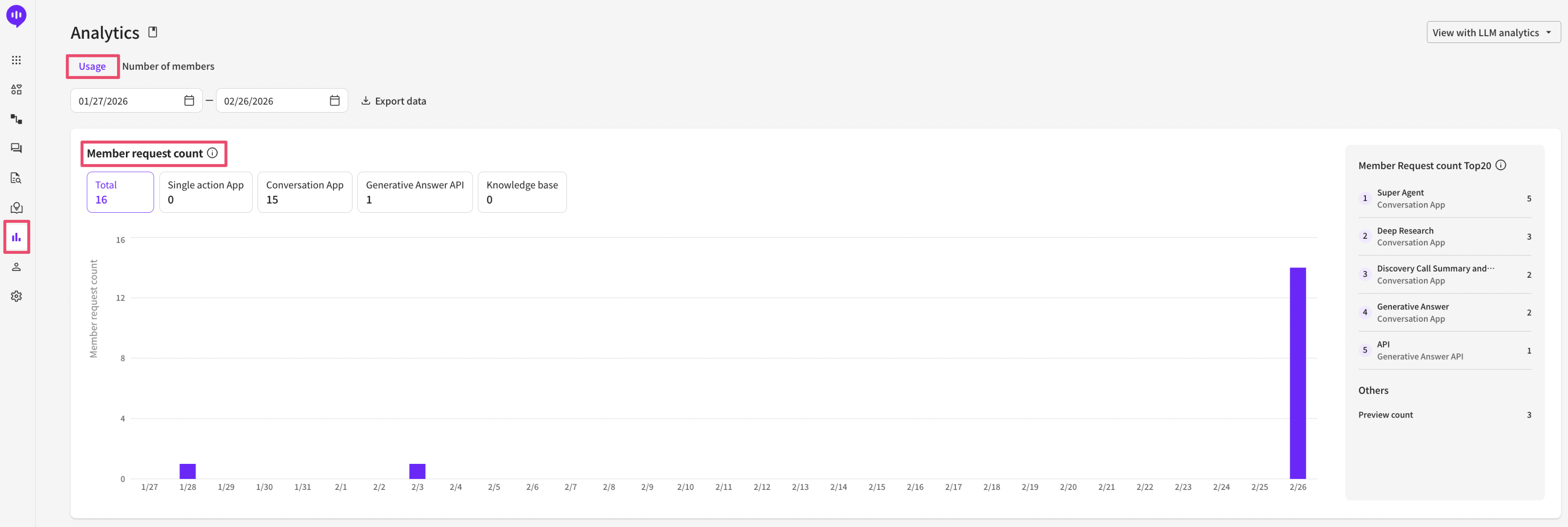 * Member request count: The number of times members in that project requested execution of LLM-related features and the number of times they provided input within apps (proceeding to the next step via button clicks, message input, etc.). - Total: The combined count of all requests from answer-type apps, conversational apps, APIs, and knowledge base. - Answer-type apps: The number of times executed via the generate button (or equivalent API call). \*If a single request triggers multiple LLM calls (for example, using document upload input), it is still counted as 1 based on the number of times the ‘generate button’ was pressed. - Conversational apps: The number of times a member provided input (message entry, button click, form submission, etc.) (or called an equivalent API). - Answer-generation API: The number of times 'answer generation' was requested via the API. This aggregation counts only answer generation, so if the API activated other apps, those are categorized and aggregated under answer-type / conversational apps. - Knowledge base: The number of times the 'Generate' button was clicked on the knowledge base screen in the Dashboard.