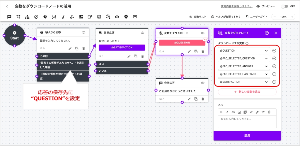 ユーザーへのメッセージを表示したり、質問することができる最も基本的なノードです。ノードのタイトルは、会話メッセージだけを表示した場合、「会話応答」、応答を追加して質問を行なった場合、「質問応答」と表示されます。顧客の応答内容は、「変数」を利用して保存することができます。